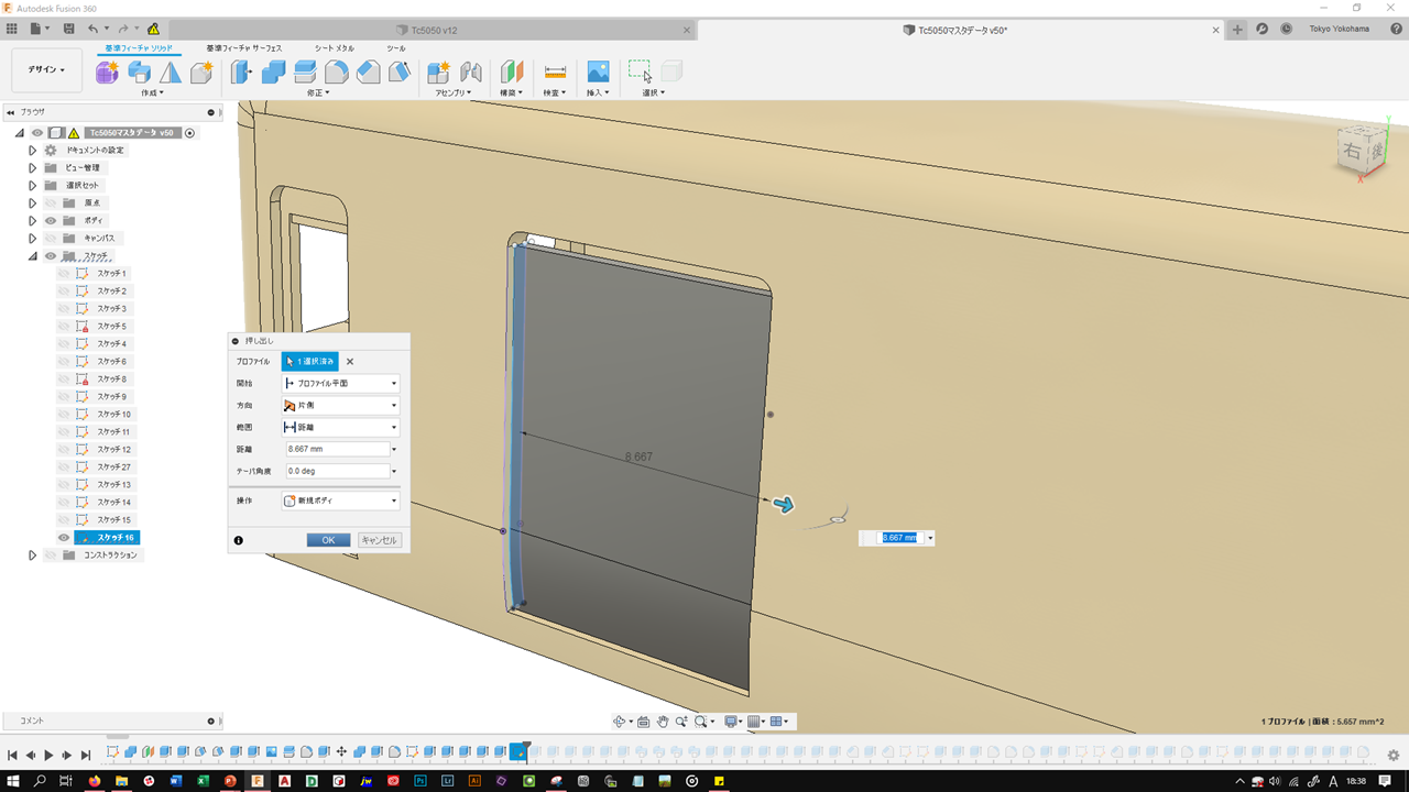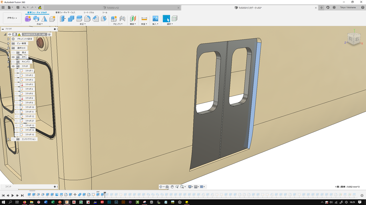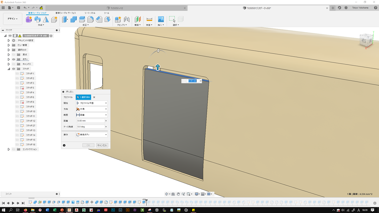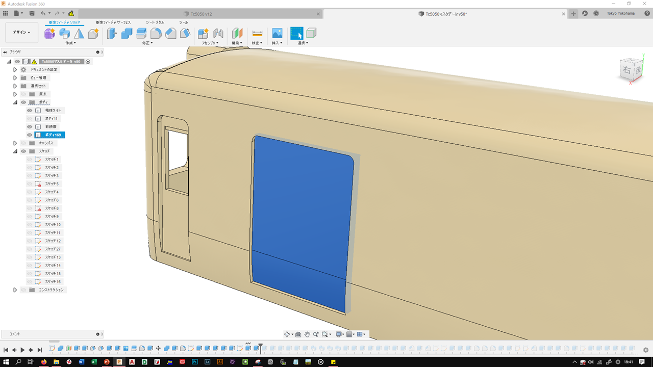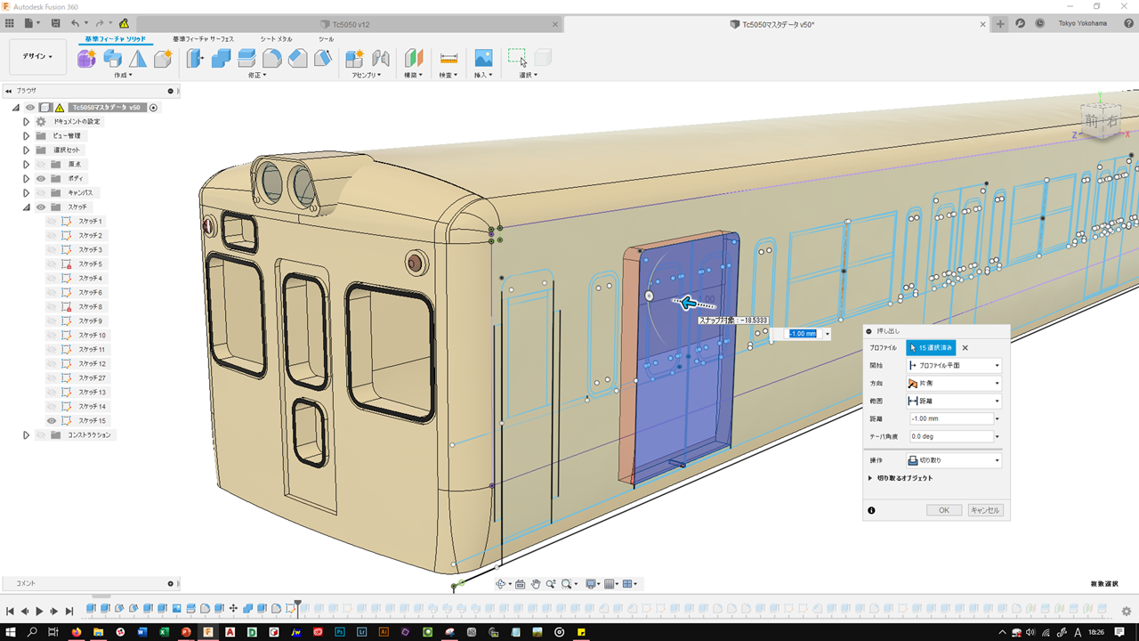 で、こうした裾絞り車体をFUSION360で製作するとき、一般的な"押出し"機能では、裾絞りのRに沿うようなドアなどの窪みを作ることができません。