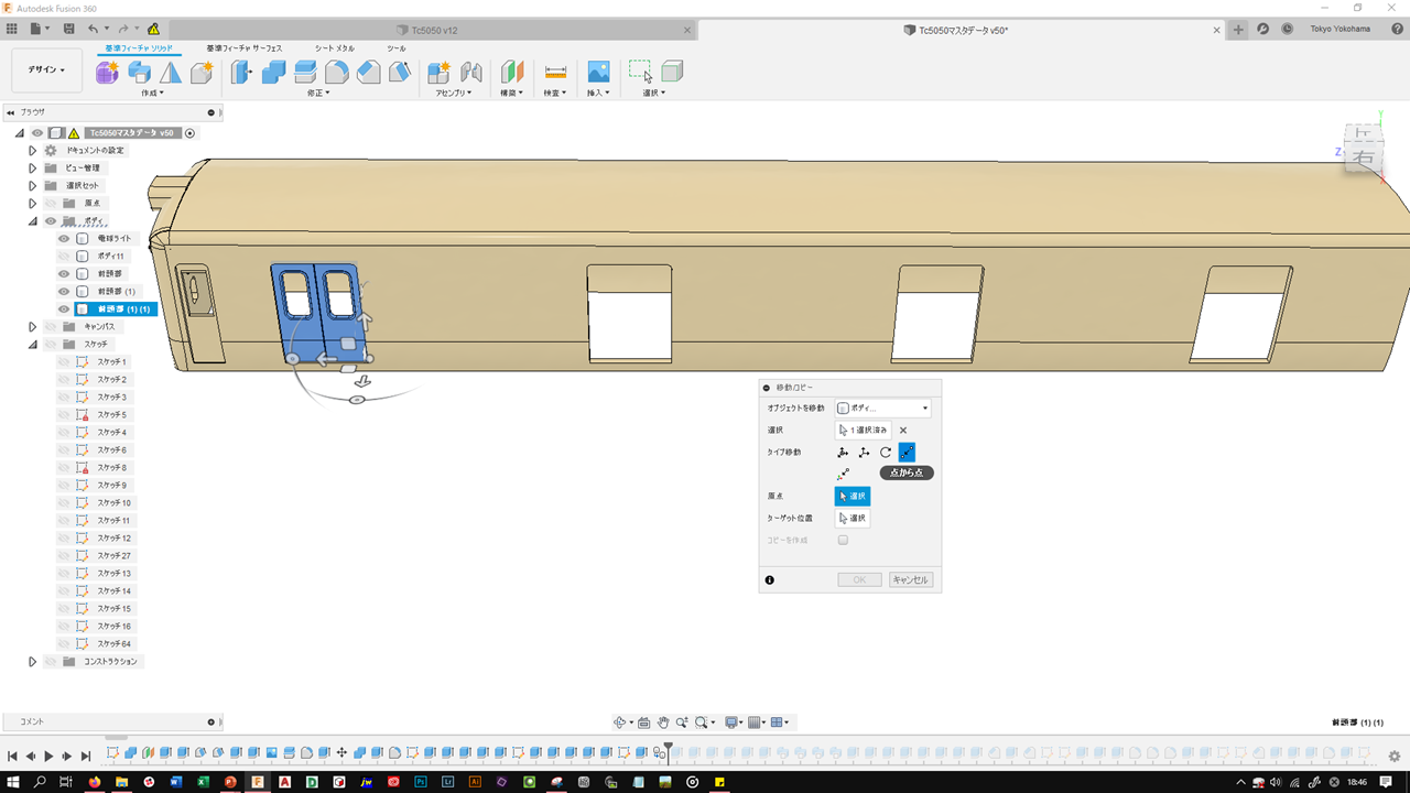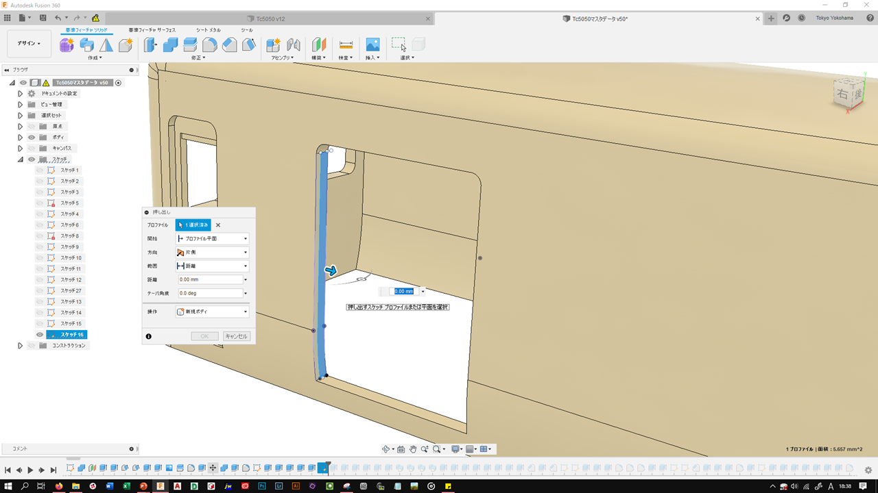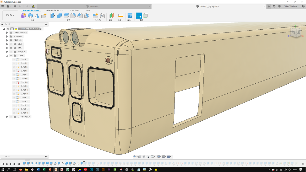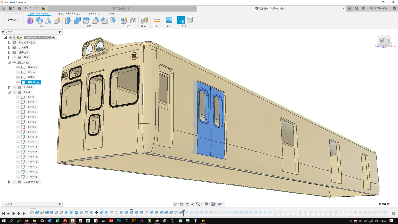 で、こうした裾絞り車体をFUSION360で製作するとき、一般的な"押出し"機能では、裾絞りのRに沿うようなドアなどの窪みを作ることができません。