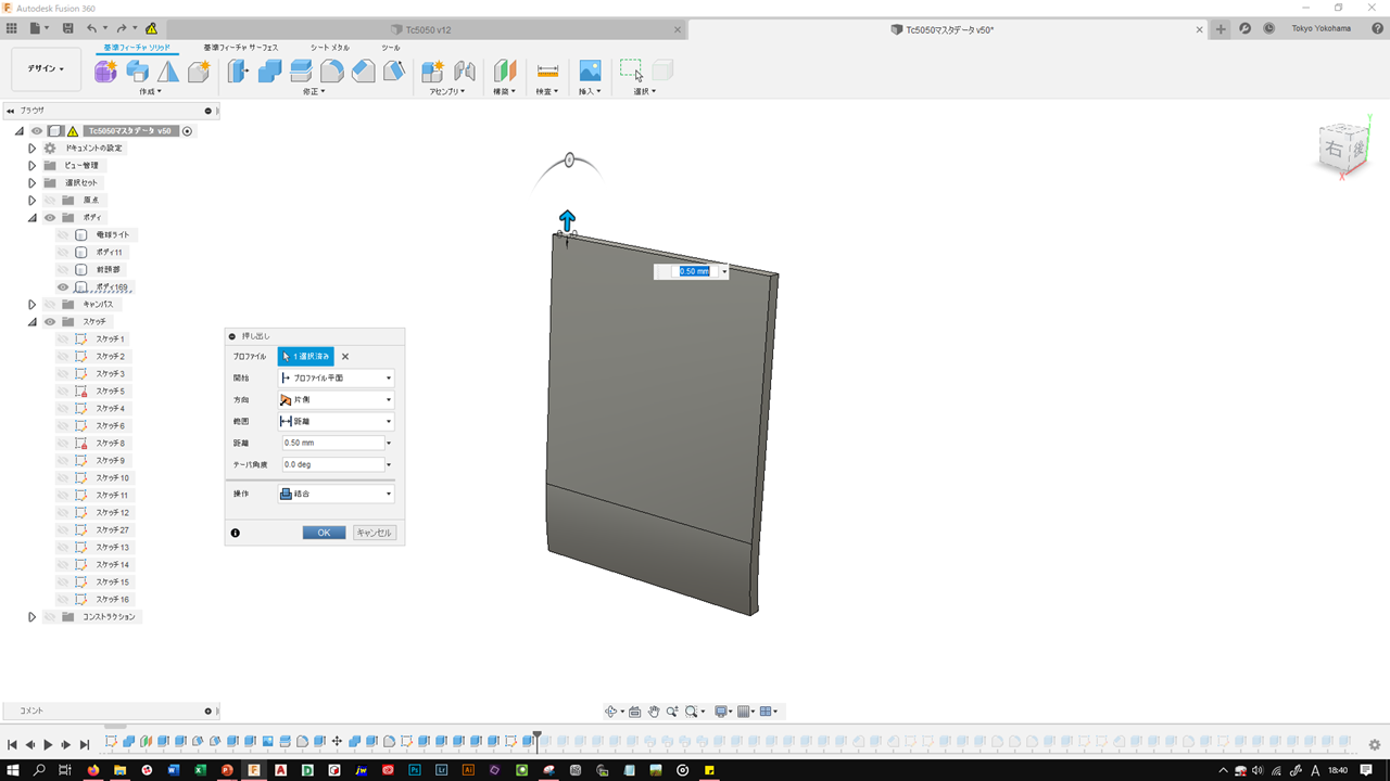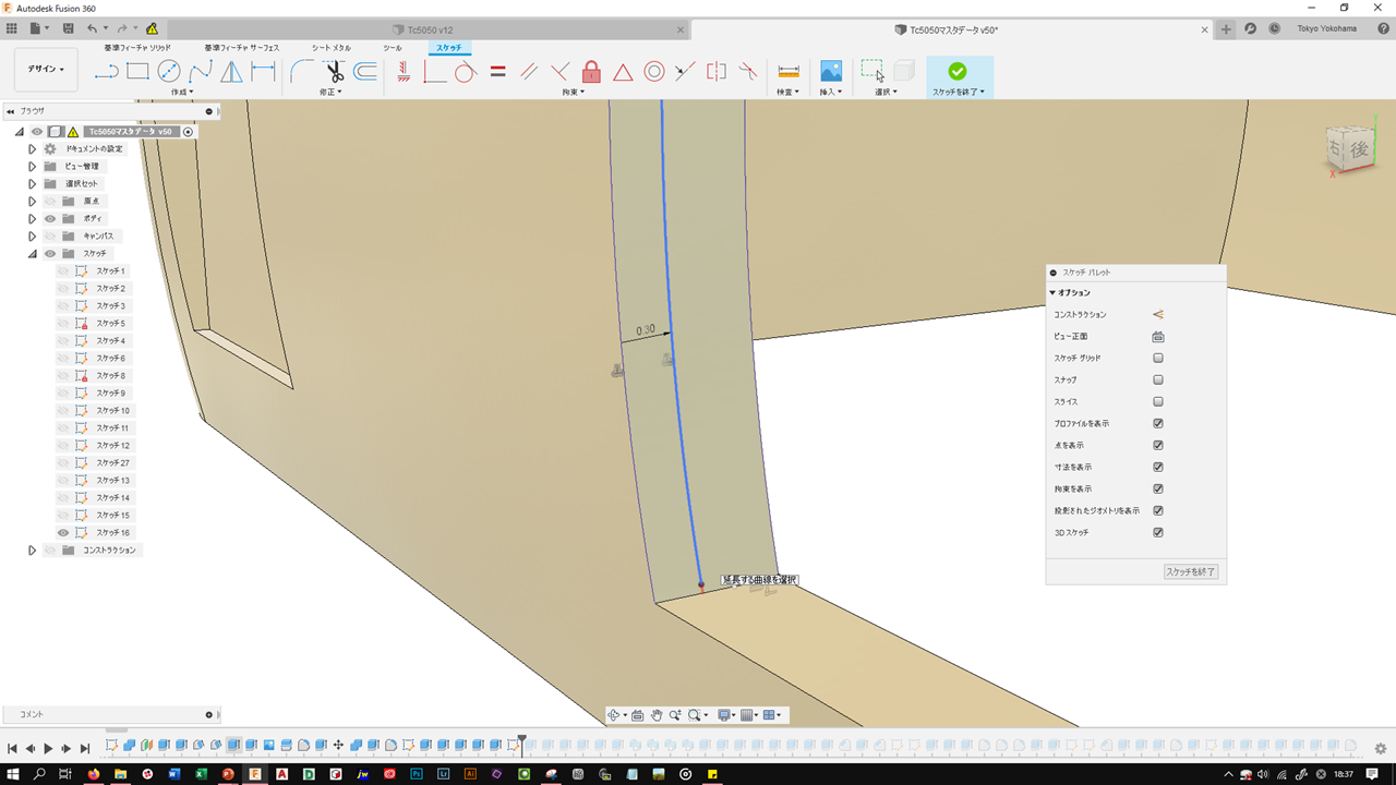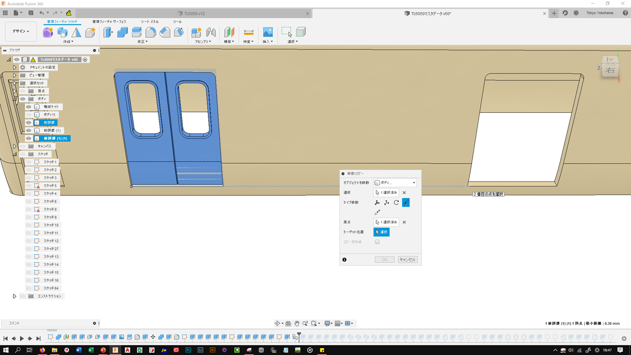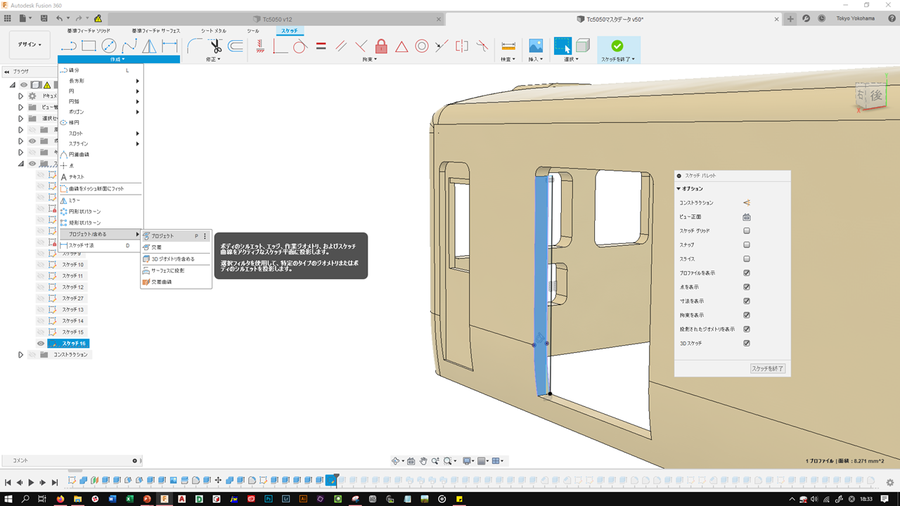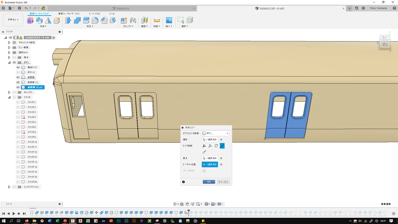 で、こうした裾絞り車体をFUSION360で製作するとき、一般的な"押出し"機能では、裾絞りのRに沿うようなドアなどの窪みを作ることができません。